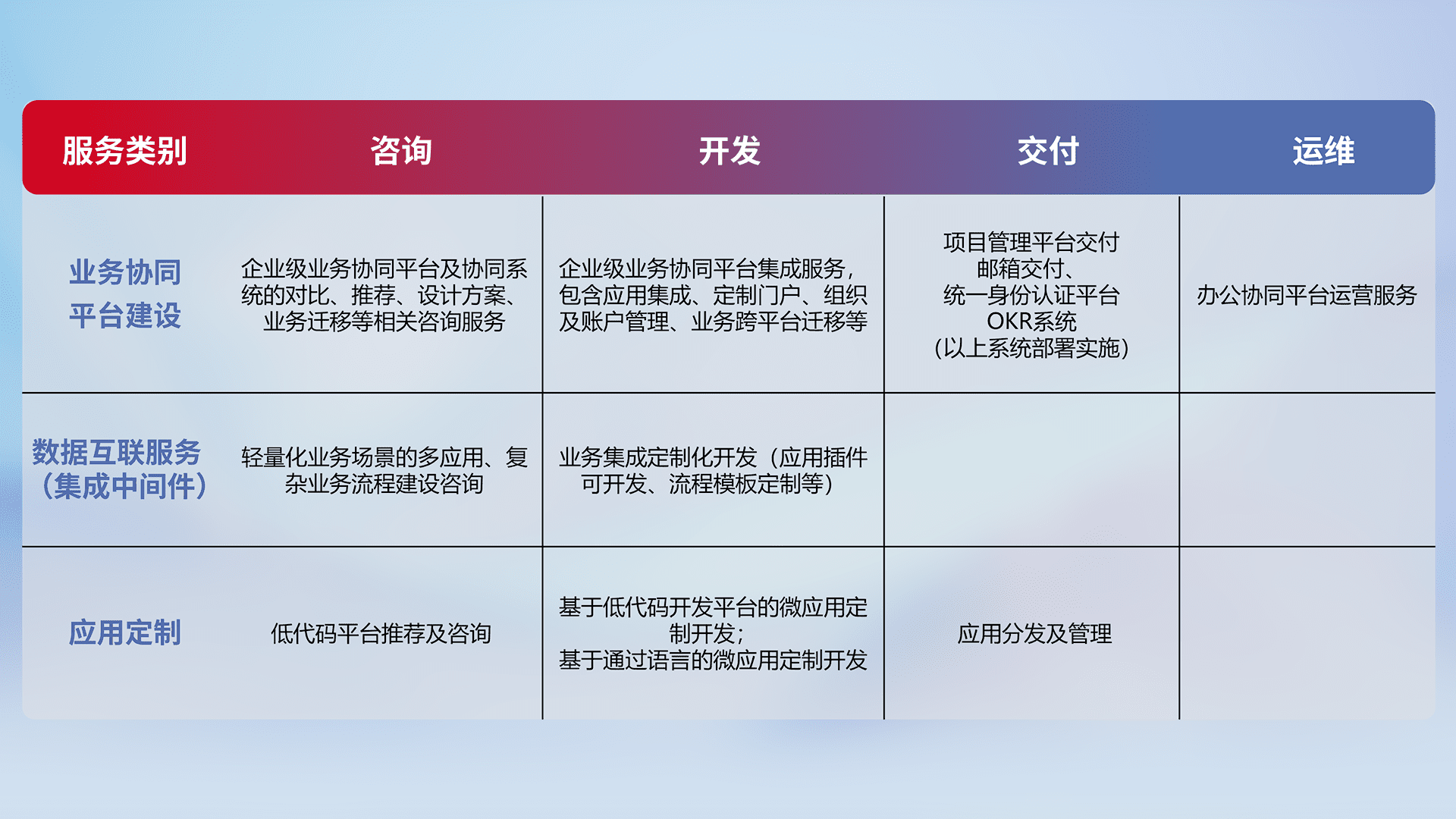 针对钉钉、、企微、、、IDaas等平台级产品提供产品的规划、、方案、、交付、、定制化开发等服务,,,实现如统一协同办公、、、、智能客户服务、、、、混合会议管理、、智能数据查询、、等业务场景,,,,实现数字化转型。。。。